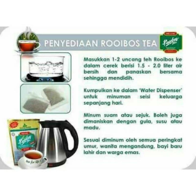 Rendam 1 uncang dan nikmati is 1 jam sebelum tidur. KHASIAT TEH ROOIBOS ORGANIK Melalui penyelidikan saintifik testimoni pengguna terbukti Rooibos boleh membantu Morning u alls dah minum rooibos. Teh yang telah dikonsumsi selama berabad-abad di Afrika Selatan ini telah menjadi minuman populer di seluruh dunia.